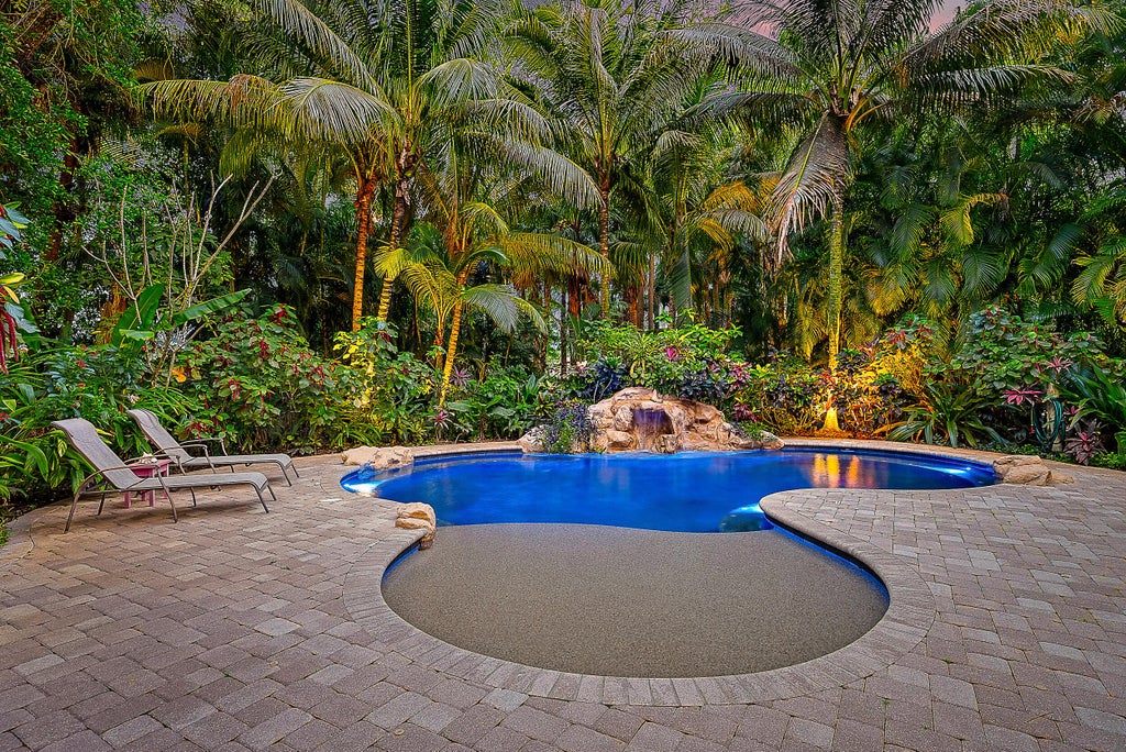 Welcome to a one-of-a-kind 1.30-acre tropical paradise in Jupiter Farms. The lush, landscaped yard is filled with mature palms, tropical plants, and winding paths that create a private, resort-like setting. A lagoon-style pool with a rock waterfall sits at the back of the property, surrounded by a large patio and a nearby tiki hut. The property flows beautifully, with the elevated home overlooking a terraced yard that leads down to a fire pit area, then back up to the pool. The CBS home features a 2020 roof, full impact windows and doors, 16' vaulted ceiling, and an open layout that flows into a screened patio overlooking the tropical paradise. A circular drive leads to a 24'x30' Pole Barn (2022) with electric, water, and lighting. Located on a Paved road on the east side of Jupiter