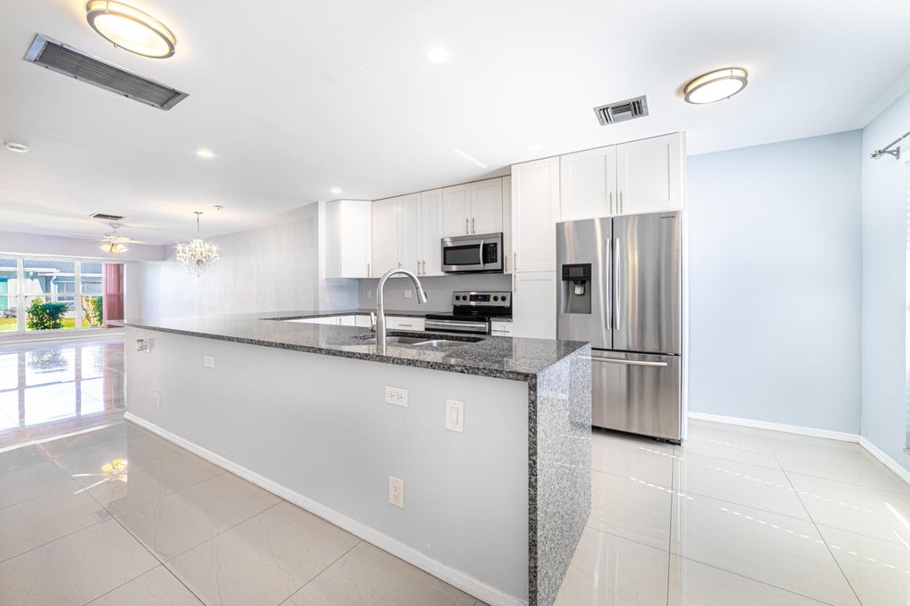 RENOVATED 2 Bedroom 2 Full Bath Corner Villa in the 55+ community of Pines of Delray West in Delray Beach. No neighbor above you. Features include Open Granite Kitchen with Waterfall Countertops, Stainless Steel Appliances & Deep Double Sink, Ceramic 23.5'' x 23.5'' Tile Flooring - no carpet, Full-Size Washer & Dryer inside, Granite Bathroom Vanities & Stall Showers, Customized Closets, Updated Electric Panel & Accordion Shutters. Enter the Screened Patio from the Primary Bedroom or Living Room. No need to drive to the Clubhouse. Parking spot in front of the unit. A/C 2022 Roof 2023. Amenities include: Clubhouse, Heated Pool & Spa, Fitness Room, Pickleball, Tennis & planned activities. Can Lease after 18 months. Maintenance Fee includes Cable, Water & Wi-Fi. Close to the Beach, Delray