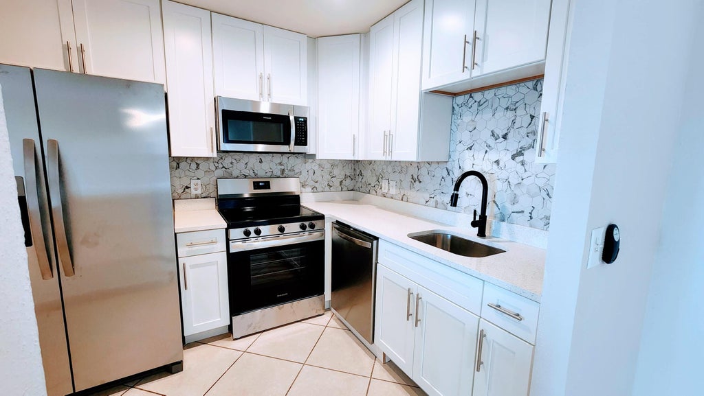 Welcome to your dream condo in the highly sought-after Kings Point Golf and Country Club, a vibrant 55+ community offering resort-style living with NO country club fees! This beautifully remodeled 1-bedroom, 1.5-bathroom home has been updated from top to bottom for modern comfort and style. Step into the brand-new kitchen, complete with rich wooden cabinetry, sparkling quartz countertops, and sleek stainless steel appliances. Both bathrooms have been fully renovated, featuring quartz countertops and modern fixtures. Enjoy the convenience of a brand-new in-unit washer and dryer, fresh paint throughout, and stylish tile flooring in every room. New ceiling fans and light fixtures add the perfect finishing touches.