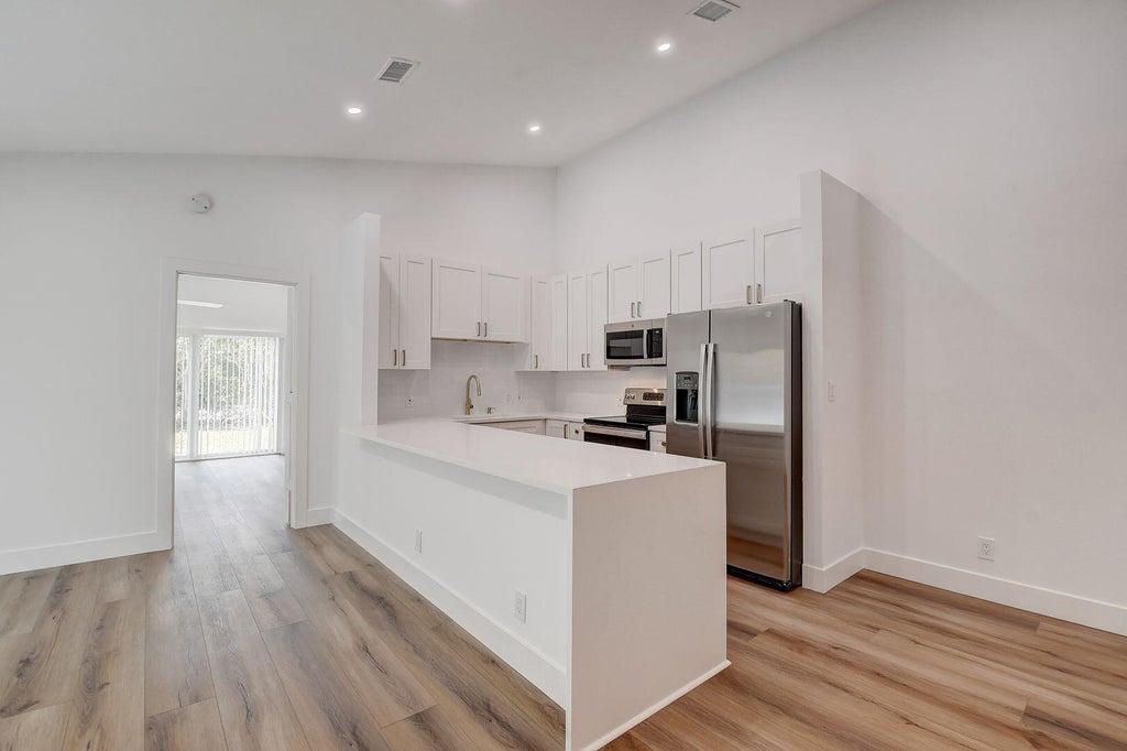 The moment you walk into this bright and spacious home you will know you have found your new place. This elegant home was meticulously updated and redesigned in 2022. Brand new everything from top to bottom, including impact windows and doors and LED lighting. With high-end finishes and vaulted ceilings throughout, this home is the airy and relaxing refuge you seek. Once you step inside this open concept home, you will feel how truly generously sized it is. The dining room is large enough for an enormous table for your holiday gatherings. The living room is capable of accommodating seating for a large group. The absolutely fabulous modern kitchen - with white shaker cabinets, waterfall countertops, stainless steel appliances, and ample storage and counter space would make any chef happy