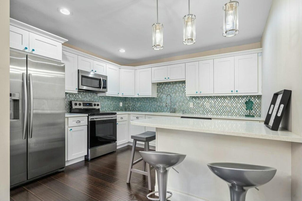 55+ Community: Beautiful modern garden villa located in the highly desirable Rainberry Bay. Home boasts a fully renovated interior, with luxury vinyl floors, 2019 new roof, and updated fixtures and finishes. This charming kitchen includes SS appliances, custom wood cabinetry, intricate backsplash, and granite counters. Owner's suite includes a spacious walk-in closet, separate bath with step-in shower. Relax in the screened patio and fenced outdoor terrace offers plenty of room for dining and entertainment. Enjoy the active 55+ lifestyle in Rainberry Bay with 5 heated pools, 8 pickle ball courts, 10 Har-Tru tennis courts, clubhouse, theatre, or enjoy the walking and biking trails that surround this lovely community.