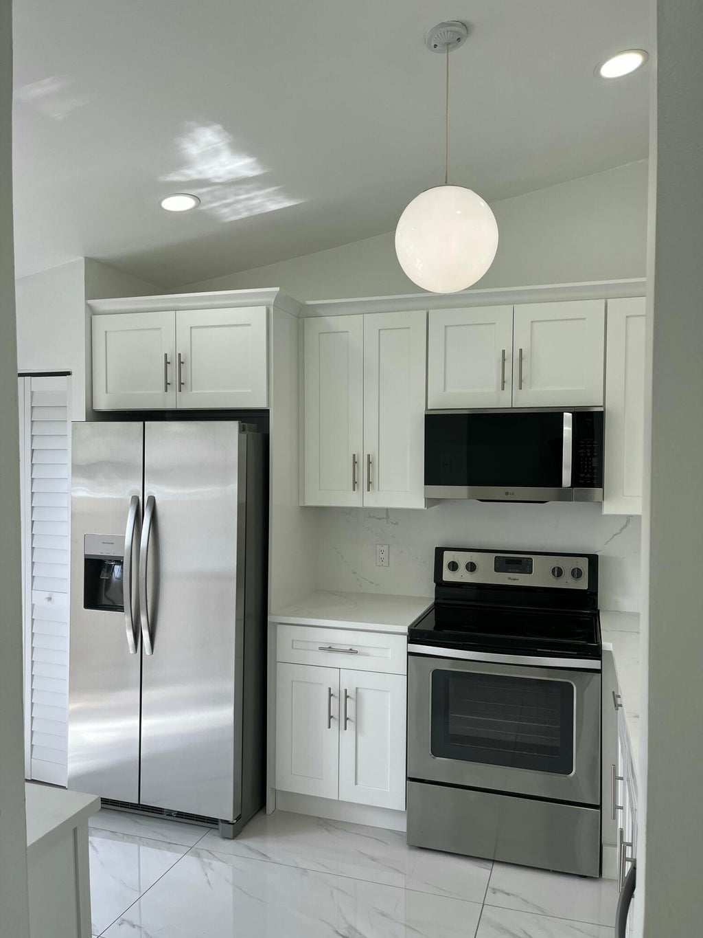 Great Location in a very desirable area in West Boca!! Newly renovated 2 bedrooms 2 bath beautiful end unit Villa. All ages are welcome in this well kept community. It is conveniently located just minutes away from State Rd-7, supermarkets, banks, Target, Walmart, the New Boca Uptown Development AND Boca West Hospital. The villa boasts an open floor concept with volume ceilings and split bedrooms. The tile flooring throughout the common areas and LPV floors in the Bedrooms add to the modern clean look interiors. The Kitchen cabinets are brand New with Beautiful Quartz counter tops that extend through the pass through window.Both Bathrooms have been tastefully renovated, and there is a washer and dryer inside the unit.In addition there is a private fenced patio, 2 assigned parking