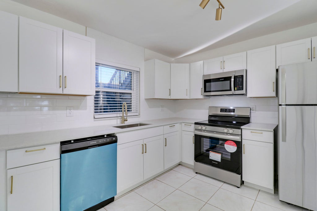 Updated first floor corner unit. Short walk to the community clubhouse and pool. 2 Bedrooms 1.5 bathrooms. 2022 Roof, hurricane windows, 2019 AC condenser, brand new kitchen cabinets, new luxurious Caesarstone quartz countertops, brand new stainless steal appliances, brand new washer/dryer set, fully updated bathrooms, brand new light fixtures, mostly tile through out (guest bedroom brand new luxury vinyl flooring), brand new window curtains, custom gold fixtures and faucets, and brand new fans. Large enclosed patio. Twin Lakes beautifully kept community features heated community pool, recreational room, tennis courts, and more. The community also hosts regular social evens at the club house. Unit can be rented out right away making it a great investment