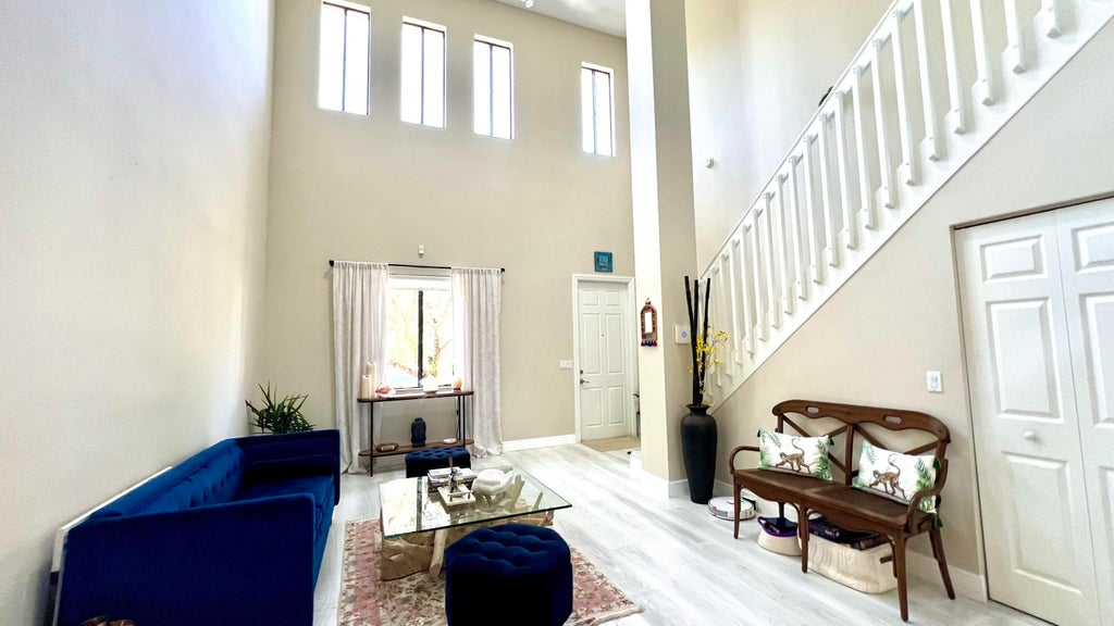 Discover this meticulously maintained Mediterranean-style 3-bedroom, 2.5-bath townhome with a 2-car garage, perfectly situated in the boutique gated community of Venetian Villas--where properties are rarely offered for rent. This canal-front residence showcases elegant upgrades throughout, including premium large plank laminate flooring, stainless steel appliances, granite countertops, and abundant cabinetry.The open-concept living areas feature soaring ceilings, a formal dining room, family room, and bonus loft with movable panels, easily converted to a den, office, playroom, or potential 4th bedroom, offering flexibility to suit your lifestyle. All bedrooms are generously sized with ample closet space, and the primary suite offers direct access to a private, covered balcony