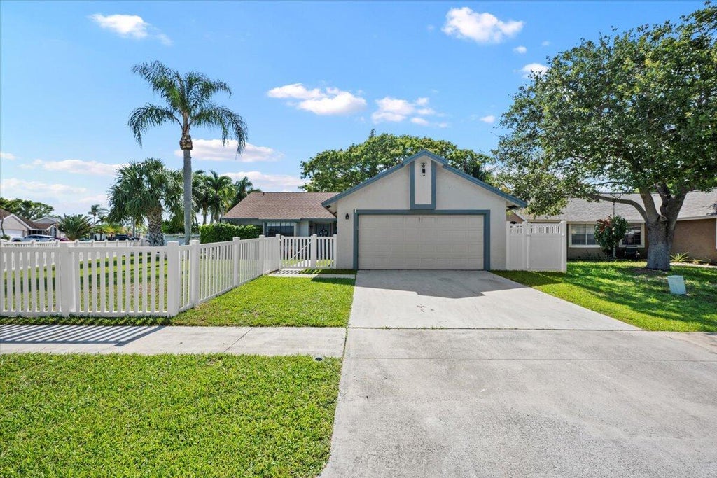 Beautifully updated and well-maintained single-family home in gated community in the heart of Boynton Beach close to dining, shopping, schools, and highways. This 4 bedroom/2 bath/2 car garage home sits on a fenced corner lot and it conveniently located near community amenities. Eat-in kitchen features stainless steel appliances, quartz countertops, mosaic tile backsplash, 42'' upper cabinets with crown molding, and pantry. Master bathroom features a double vanity and spa shower. Neutral tile throughout (no carpet). Rear addition is considered 4th bedroom on PAPA and could be used as a den/playroom as well. Low HOA.