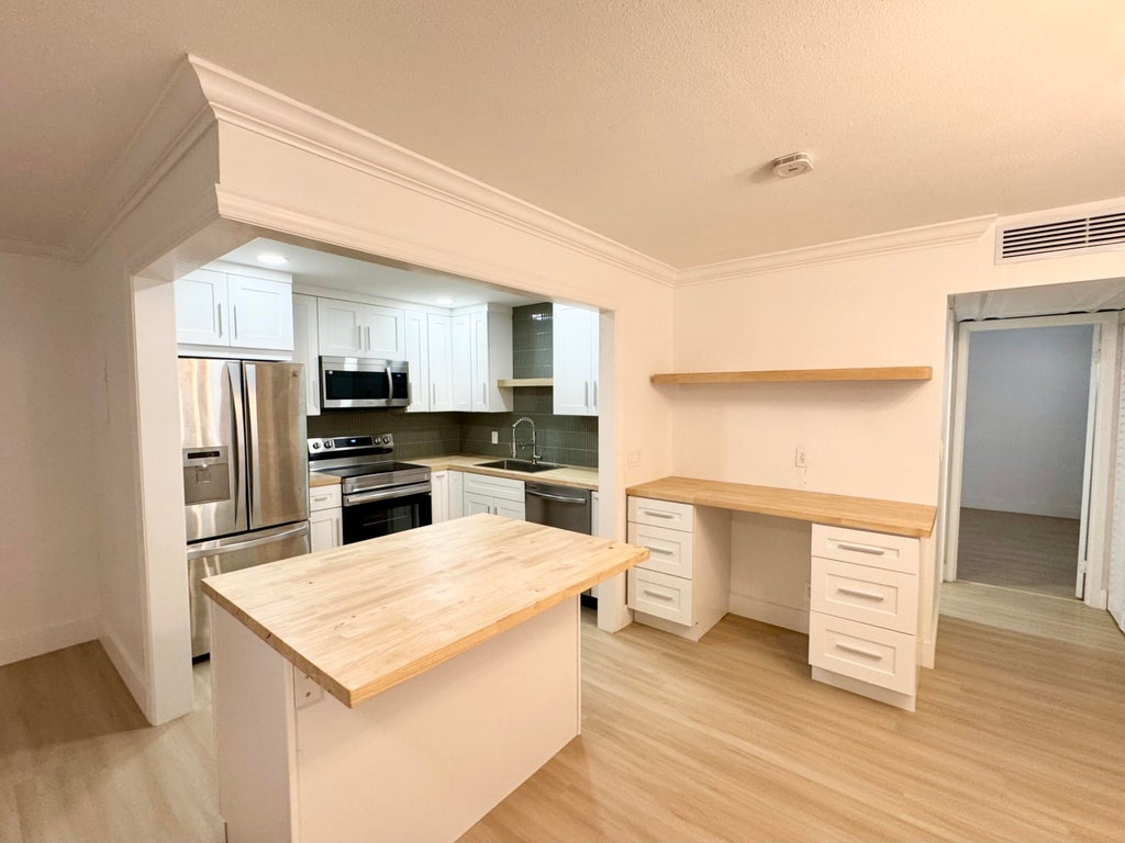 Both beautiful and pristine this updated 1 bedroom is ready for occupancy! Open kitchen with butcher block countertops, crate and barrel floating shelving, custom coffee bar and desk with extra storage and brand new stainless steel appliances.Bathrooms upgraded. Upgraded vinyl flooring.Entire Condo newly painted. Recessed lighting and new ceiling fans .New AC and Nest Thermostat. Brand New Full size W&D.Enclosed Patio.This unit has not ben occupied since upgrades have been done be the first one to enjoy this beautiful unit!