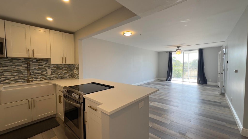 UPDATED 3/2 CORNER UNIT IN BOCA TEECA IN EAST BOCA WITH 1200 SQ FT. KITCHEN WITH WHITE CABINETRY QUARTZ COUNTERS AND STAINLESS APPLIANCES. LAMINATE FLOORING THROUGHOUT. MASTER BATH WITH WALK IN SHOWER. GUEST BATH SHOWER / TUB COMBO. LARGE SCREENED IN PATIO OFF LIVING AREA. 1.25 MILES TO BOCA'S BEACHES AND DOWNTOWN BOCA AND DELRAY BEACH. STACKABLE WASHER / DRYER IN UNIT. WATER, CABLE, AND GARBAGE INCLUDED IN RENT. COMMUNITY OFFERS ELEVATOR AND POOL. NO PETS. ONE PARKING SPOT.