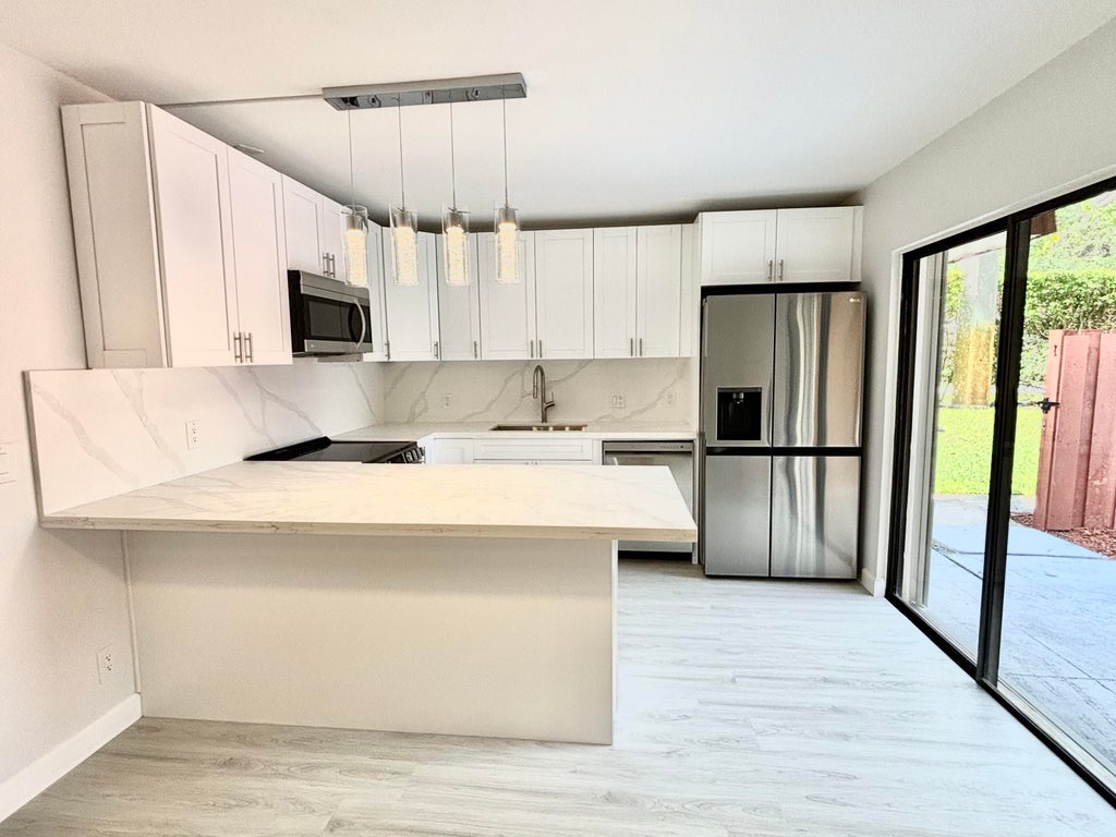 Recently renovated, this two-story, 2-bedroom, 2.5-bathroom townhome epitomizes modern comfort and style. All main floor opens to a private fenced courtyard. allowing for lots of natural light. Main floor has large living room w/ a stylish mini bar, spacious dining room, a fully remodeled kitchen, a half bathroom, and a washer & dryer. Vinyl flooring throughout the entire unit, The kitchen features brand-new cabinets, quartz countertops, and state-of-the-art stainless-steel appliances. Two master suites ups both w/ remodeled bathrooms. Private courtyard for entertaining. 2 assigned spot & lots of guest parking. Excellent Delray location close to I95, beaches and downtown. Well kept community w/pool & tennis/pickleball courts. Cable included. Don't miss this one