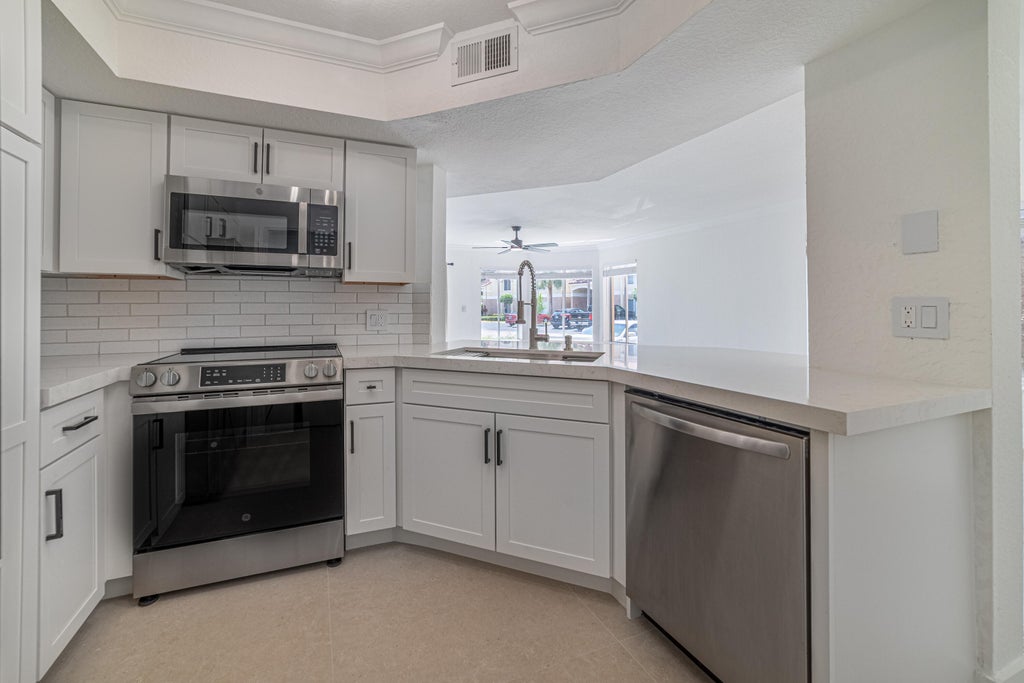 Enjoy living in this beautifully Renovated 2-bedroom, 2-bathroom corner unit located on the first floor in the highly desirable community of Casablanca Isles. This spacious and bright apartment offers stunning views of the tennis courts and garden. The modern kitchen has been fully updated with Quartz countertops, a stylish backsplash, brand-new cabinetry, and stainless steel appliances. The home also features new tile flooring throughout, crown molding, upgraded baseboards, and freshly painted, Each of the two bedrooms includes a walk-in closet with built-in shelving and a fully updated private bathroom. Step outside to the tiled patio. In-unit washer and dryer, a 2021 A/C, and 2020 water heater. Water included in the monthly rent.