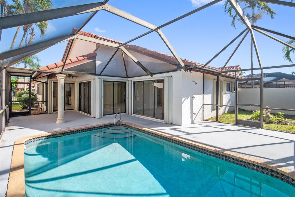 Come see this freshly painted 3 bedroom/2 bathroom 1576 SQFT home with granite kitchen countertops, a stainless-steel split sink, new fridge, a bright & naturally lit living room overlooking the covered patio and private screened-in pool that was just diamond brited, vaulted ceiling throughout, dual vanities in the master bath, jacuzzi tub with separate shower, walk-in closets, hurricane protection, two-car garage, driveway parking, poolside outdoor shower, a paved backyard patio, community tennis court, conveniently located next to Del Prado Elementary, near 3 grocery stores (Grove Kosher/Aldi/Publix), the Boca Raton Town Center Mall, Sugar Sand Park, Boca Del Mar parks, schools, highways, and places of worship. It can be rented immediately with a long-term Lease & HOA approval.