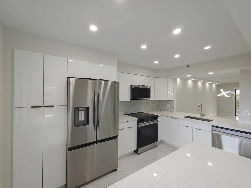 Beautiful and bright, remodeled from top to bottom LANCASTER CORNER unit with extra windows, across the street from newly renovated state-of-the-art Clubhouse and pool next to the building. Everything is new: open kitchen, rectified porcelain 48''x24'' tiles throughout, EuroDesign glossy cabinets with finger edge pulls, top of the brand modern Samsung appliances with counter-depth refrigerator, quartz countertops. Custom made soffit lights and retractable ceiling fans in all rooms, designer bathrooms, shelved walk-in closets, separate laundry room with new washer/dryer, 2023 A/C. Enclosed spacious balcony with panoramic lake views. The Huntington Lakes is a great active lifestyle community with dozen clubs by interests, shows, movies, a broad array of activities and...