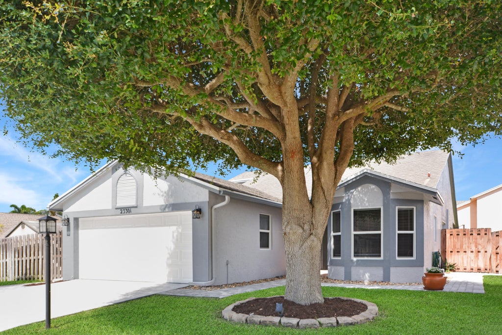 This beautiful, light & bright 3 bdrm, 2 bathroom, 2 car garage home on a large corner lot in the charming community of Boca Trace is a must see! Recent upgrades include new vanities in both bathrooms, stainless steel refrigerator & dishwasher, washer/dryer, water heater, freshly painted exterior & interior walls, complete with impact windows/garage door and new garage door motor. The open floor plan, vaulted ceilings & impact sliding doors provide endless natural light throughout the living, dining and kitchen areas. Enjoy the Florida lifestyle in the privacy of your backyard with recently added patio/walkway pavers and shadow-wood fencing & gate. Low monthly HOA fees include cable/internet, maintenance of common areas, & community pool. Pet friendly neighborhood and top-rated schools!