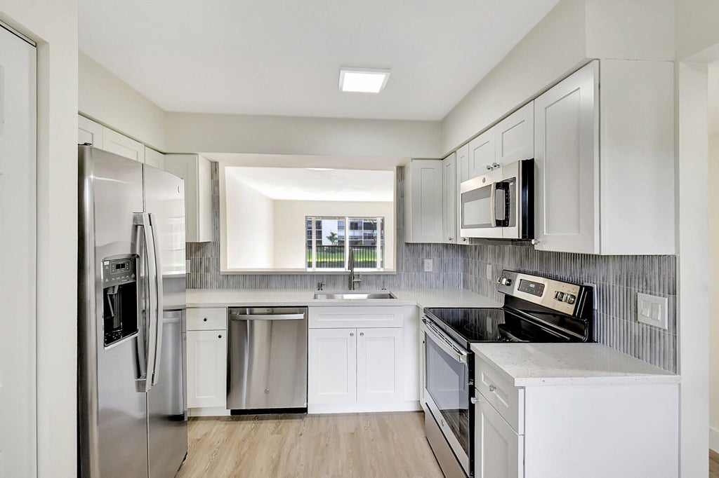 Newly renovated, never been lived in custom model of the 1 bedroom and 2 bathroom apartment in Huntington Lakes. Light and bright with sliding glass doors to the covered screened in patio from the great room and the primary bedroom. Primary bedroom features 2 walk in closets, and the bathroom has step in shower, raised cabinets and lighted mirror. Kitchen is beautiful with expanded pass through from the undermounted sink, and counter to the dining area. Built in microwave, shaker cabinets with corner shelving, Washer and Dryer and Pantry in the kitchen.. New A/C . Community requires tenant to be 55+. This floor plan has been revised to include a tub/shower combination in the 2nd bathroom and a bonus room.