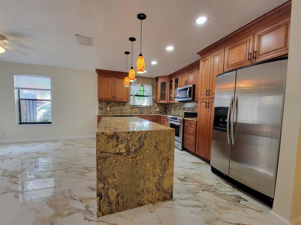 Beautifully Renovated 3-Bedroom, 3-Bath Townhome in Golfview Harbour Estates!Welcome to this rarely available and tastefully updated 3-bedroom, 3-full-bath townhome located in the quiet, well-kept community of Golfview Harbour Estates. From the moment you step inside, you'll appreciate the thoughtful renovations and spacious layout designed for both comfort and style.The heart of the home is the open-concept kitchen, featuring a stunning waterfall island, sleek stainless steel appliances, and ample cabinet space--perfect for entertaining or casual family meals. The main living area is finished with durable tile flooring and a full guest bathroom downstairs for added convenience.
