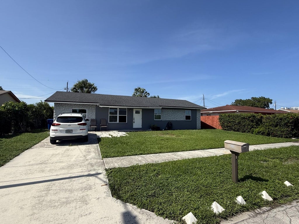 4 bedroom 2 bathroom single family home with large yard available for immediate rent. This home features tile flooring throughout, a primary bedroom suite, a den, living room, plenty of storage and a nice kitchen with stainless steel appliances. There are two parking spaces in the driveway, plus street parking. Lawn care is included in the price of the rent. Large back yard with a patio. This home is located in a quiet neighborhood that is close to parks, shopping and just a few minutes to West Palm Beach and Palm Beach Gardens. Must provide one month of paystubs and photo ID prior to arranging a tour of the home. No exceptions. First month and 2 months of security plus a $100 admin fee due at move in. Credit and background report is $43 per person.