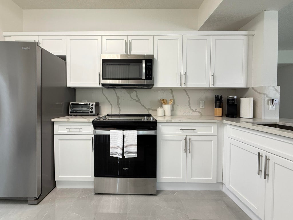 Rare opportunity! The only condo currently available at Legacy Place with a private attached garage and direct entry into the unit-no hallways or breezeways! Beautifully updated 1 bed / 1 bath first-floor corner unit featuring an open floor plan, quartz kitchen countertops, custom white shaker cabinetry, stainless steel appliances, gorgeous tile flooring throughout, oversized shower, full-size washer/dryer, and a covered private patio. The whole unit was freshly painted and equipped with custom modern lighting. This is a gated, pet-friendly community offering resort-style amenities: pool, spa, fitness & business centers, tennis, grilling areas, and more. Walk to shops and restaurants. Minutes to beaches, Gardens Mall, and PBI. Can rent immediately-perfect both for investors and homeowners