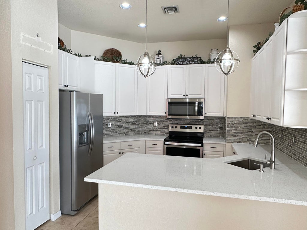 Welcome to your dream home! This fabulous and spacious corner townhome offers 3 bedrooms and 2.5 baths, perfect for comfortable living. Step into a stunning white kitchen adorned with quartz countertops and sleek stainless steel appliances, a chef's delight. The master suite, conveniently located on the first floor, ensures easy living, while two extra-large bedrooms upstairs provide ample space and privacy, complemented by a full bath. The thoughtfully designed layout includes a convenient half bath downstairs, ideal for guests. A full-size washer and dryer in a separate laundry room make chores a breeze. Enjoy the expansive open floor plan with vaulted ceilings that create an airy ambiance and invite natural light throughout the home. Step outside to your own personal oasis - a large