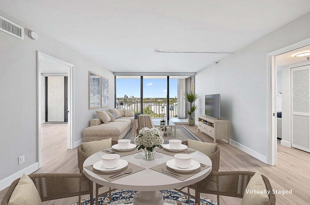 Location, location, location! Lovely condo comes with garage parking, oversized balcony which overlooks the beautiful town of Jupiter-enjoy daily sunset views! In process of installing vinyl tile in remaining tiled areas. Quartz countertops in kitchen, new oven, kitchen lighting/ceiling & electric blinds. Oceancrest is one of the best buildings on the beach & offers a resort style pool, spa, on-site management, club room, fitness center, media room, hobby room, library &24 hour security! Available furnished or unfurnished annual lease. Close to restaurants & shops--walk across the street to the ocean. All utilities included except electric.