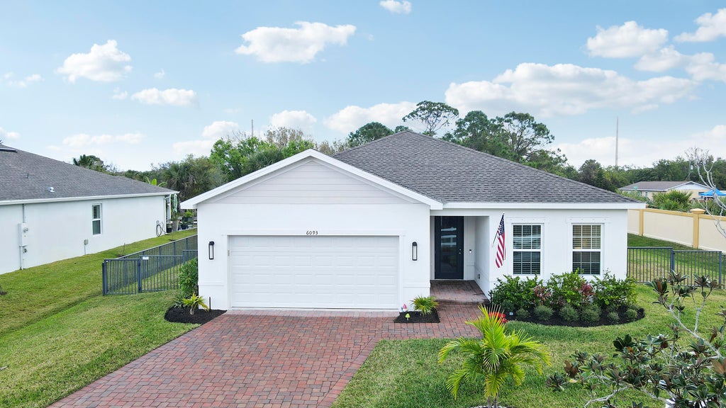 Home sweet home! Charming 3BR+Den/2BA/2CG home built in 2022 on a 0.31 acre CORNER LOT with a fully fenced yard! Open floor plan with white kitchen, quartz counters, stainless steel appliances and split bedrooms. Master suite w/ accent wall, large walk-in closet, views of the back yard and ensuite dual sinks and spacious tiled shower. The den/office with french doors is perfect for a home office or a flex space. Two additional bedrooms share a hall bathroom. The back yard is perfect for pets and has endless possibilities with room for a screened lanai, pool or your very own tropical paradise. Located a short drive from the beach, shops, dining, breweries and downtown Vero. Call today!