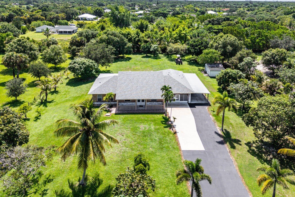 Immaculate and spacious 4-bedroom, 2-bath, 2-car garage home on over 1.5 acres on paved road access in Jupiter Farms! This well-designed property offers a split floor plan featuring a formal dining room, kitchen with granite counters opens to large family room and casual dining area. The entire home is tiled with a decorative tile inlay at the front door. Retreat to the oversized master suite with an extra-large walk-in closet and generous master bathroom. Additional expansive 49' x 18' enclosed patio--ideal as a game room, gym, or entertainment space, complete with a wet bar. The 2 car garage has been converted into a second kitchen and dining area, perfect for in-law living or extended family use. A one car covered parking area located just off the garage. For your security there ...is a full screen camera system covering the outside. Enjoy the completely fenced spacious lot with paved access all the way to the house, offering plenty of room for your toys, animals, or future expansion.